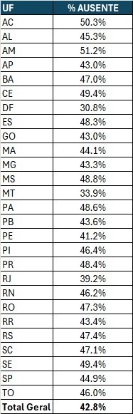 O índice de abstenção variou significativamente entre os estados, com o Amazonas (AM) registrando o maior número de faltosos, com 51.2%. Em contraste, o Distrito Federal (DF) teve o menor índice, com 30.8%.